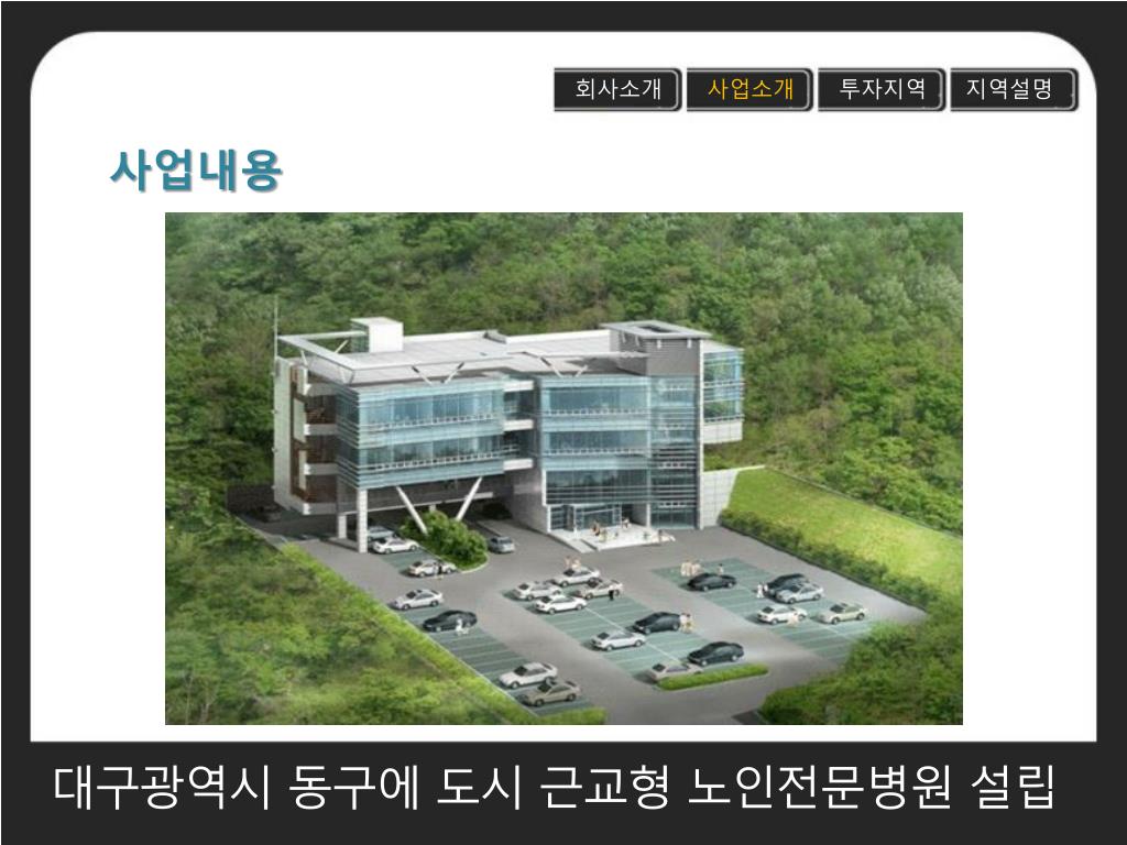 회사소개 사업소개 투자지역 지역설명 사업내용 대구광역시 동구에도시 근교형 노인전문병원 설립