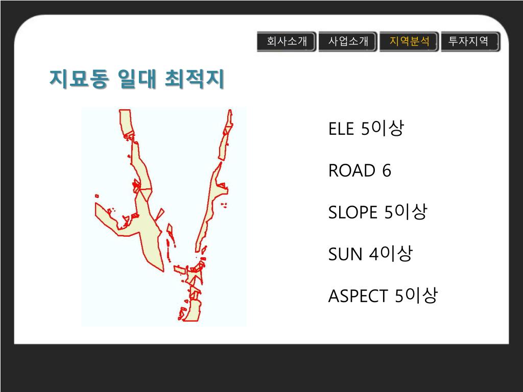 회사소개 사업소개 지역분석 투자지역 지묘동 일대 최적지 ELE 5이상 ROAD 6 SLOPE 5이상 SUN 4이상 ASPECT 5이상