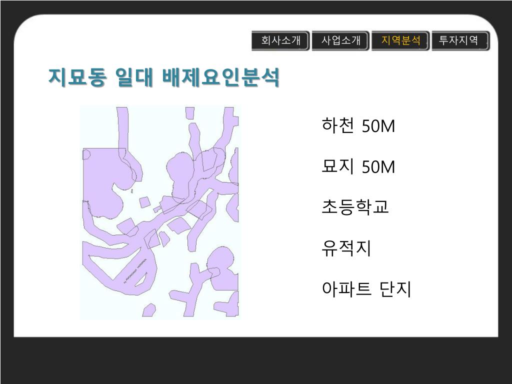 회사소개 사업소개 지역분석 투자지역 지묘동 일대 배제요인분석 하천 50M 묘지 50M 초등학교 유적지 아파트 단지