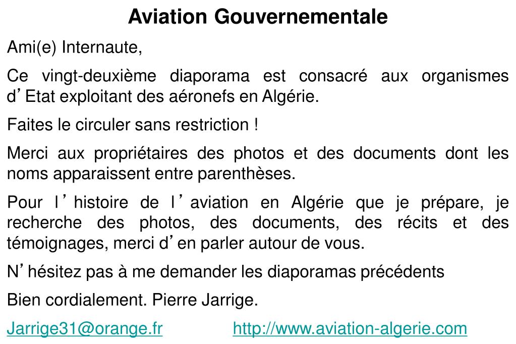Aviation Gouvernementale Ami(e) Internaute, Ce vingt-deuxième diaporama est consacré aux organismes d’Etat exploitant des aéronefs en Algérie. Faites le circuler sans restriction ! Merci aux propriétaires des photos et des documents dont les noms apparaissent entre parenthèses. Pour l’histoire de l’aviation en Algérie que je prépare, je recherche des photos, des documents, des récits et des témoignages, merci d’en parler autour de vous. N’hésitez pas à me demander les diaporamas précédents Bien cordialement. Pierre Jarrige. Jarrige31@orange.frhttp://www.aviation-algerie.com