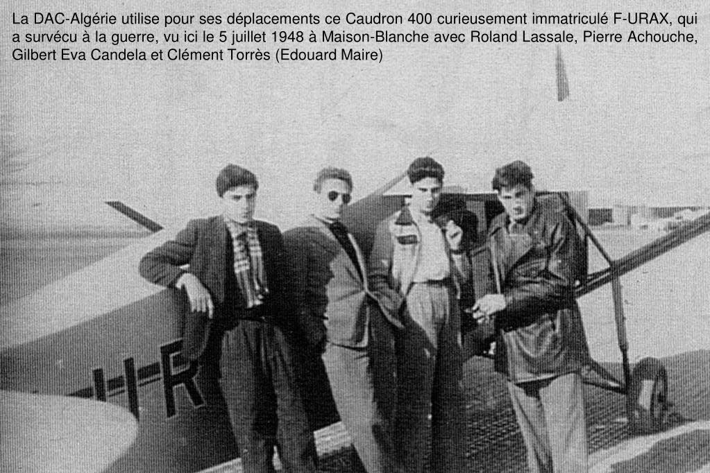 La DAC-Algérie utilise pour ses déplacements ce Caudron 400 curieusement immatriculé F-URAX, qui a survécu à la guerre, vu ici le 5 juillet 1948 à Maison-Blanche avec Roland Lassale, Pierre Achouche, Gilbert Eva Candela et Clément Torrès (Edouard Maire)
