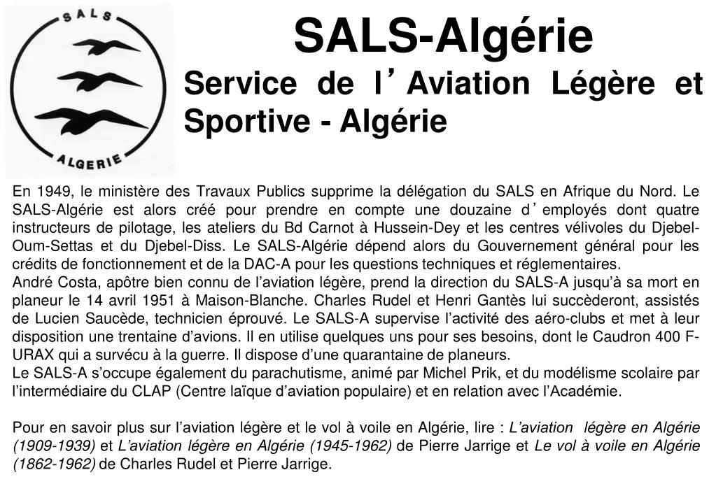 SALS-Algérie Service de l’Aviation Légère et Sportive - Algérie En 1949, le ministère des Travaux Publics supprime la délégation du SALS en Afrique du Nord. Le SALS-Algérie est alors créé pour prendre en compte une douzaine d’employés dont quatre instructeurs de pilotage, les ateliers du Bd Carnot à Hussein-Dey et les centres vélivoles du Djebel-Oum-Settas et du Djebel-Diss. Le SALS-Algérie dépend alors du Gouvernement général pour les crédits de fonctionnement et de la DAC-A pour les questions techniques et réglementaires. André Costa, apôtre bien connu de l’aviation légère, prend la direction du SALS-A jusqu’à sa mort en planeur le 14 avril 1951 à Maison-Blanche. Charles Rudel et Henri Gantès lui succèderont, assistés de Lucien Saucède, technicien éprouvé. Le SALS-A supervise l’activité des aéro-clubs et met à leur disposition une trentaine d’avions. Il en utilise quelques uns pour ses besoins, dont le Caudron 400 F-URAX qui a survécu à la guerre. Il dispose d’une quarantaine de planeurs. Le SALS-A s’occupe également du parachutisme, animé par Michel Prik, et du modélisme scolaire par l’intermédiaire du CLAP (Centre laïque d’aviation populaire) et en relation avec l’Académie. Pour en savoir plus sur l’aviation légère et le vol à voile en Algérie, lire : L’aviation légère en Algérie (1909-1939) et L’aviation légère en Algérie (1945-1962) de Pierre Jarrige et Le vol à voile en Algérie (1862-1962) de Charles Rudel et Pierre Jarrige.