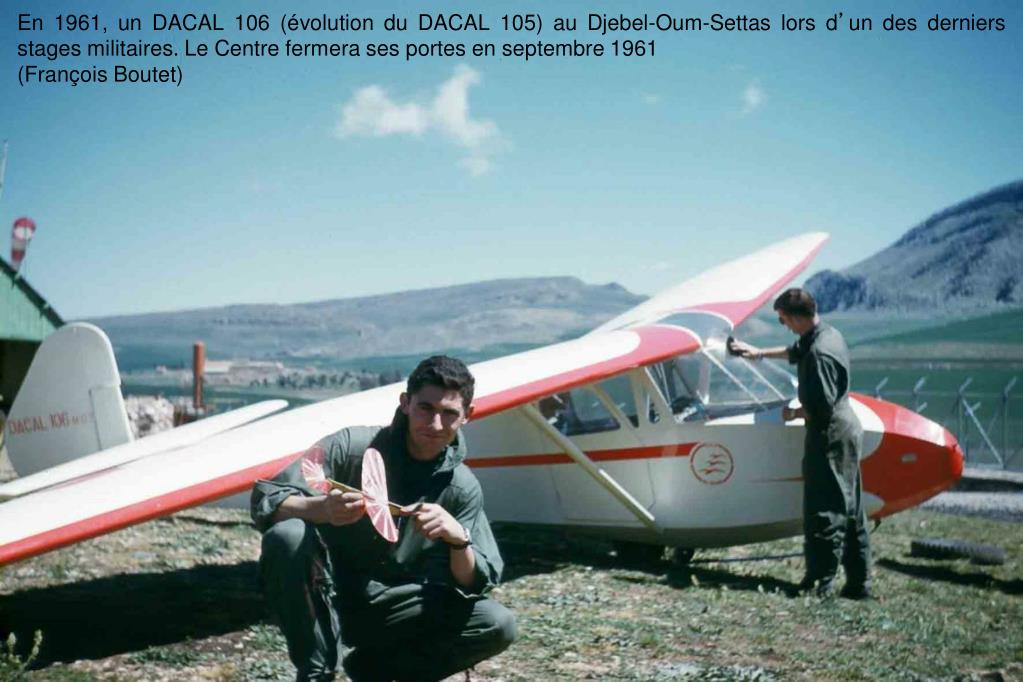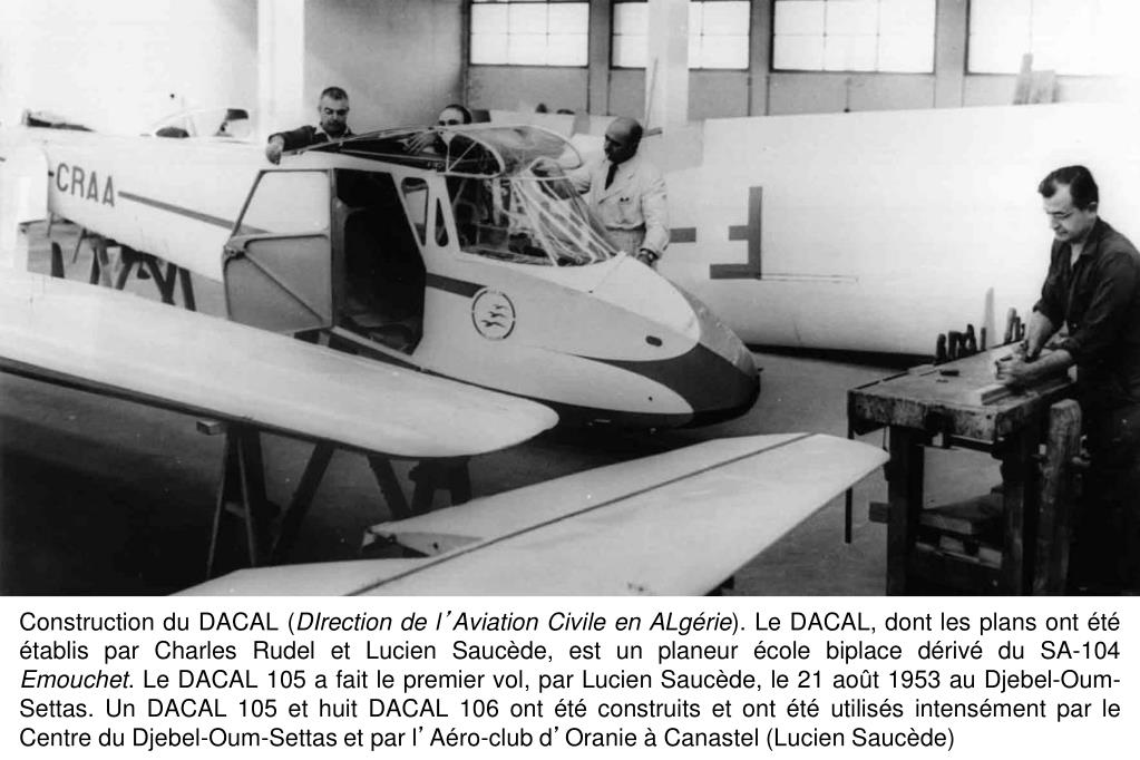 Construction du DACAL (DIrection de l’Aviation Civile en ALgérie). Le DACAL, dont les plans ont été établis par Charles Rudel et Lucien Saucède, est un planeur école biplace dérivé du SA-104 Emouchet. Le DACAL 105 a fait le premier vol, par Lucien Saucède, le 21 août 1953 au Djebel-Oum-Settas. Un DACAL 105 et huit DACAL 106 ont été construits et ont été utilisés intensément par le Centre du Djebel-Oum-Settas et par l’Aéro-club d’Oranie à Canastel (Lucien Saucède)