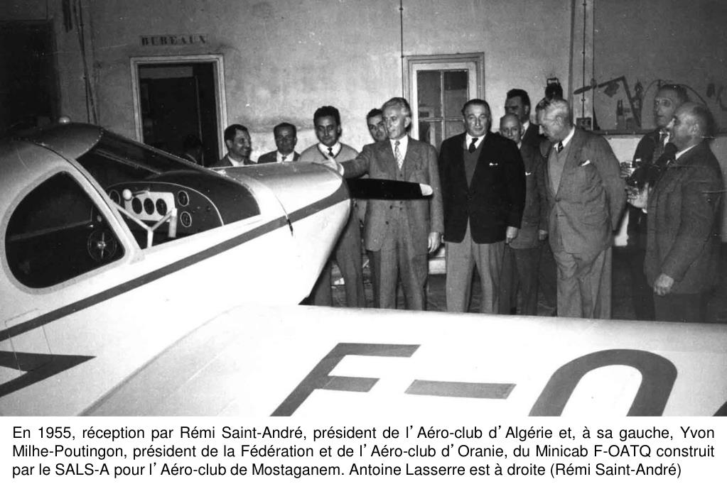 En 1955, réception par Rémi Saint-André, président de l’Aéro-club d’Algérie et, à sa gauche, Yvon Milhe-Poutingon, président de la Fédération et de l’Aéro-club d’Oranie, du Minicab F-OATQ construit par le SALS-A pour l’Aéro-club de Mostaganem. Antoine Lasserre est à droite (Rémi Saint-André)