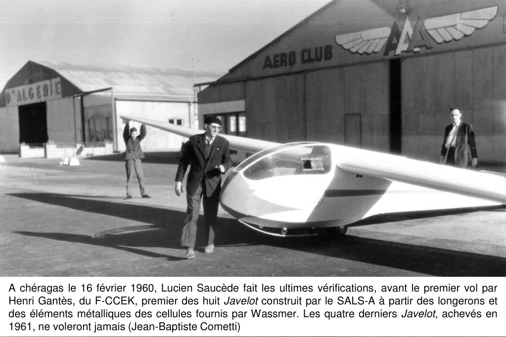 A chéragas le 16 février 1960, Lucien Saucède fait les ultimes vérifications, avant le premier vol par Henri Gantès, du F-CCEK, premier des huit Javelot construit par le SALS-A à partir des longerons et des éléments métalliques des cellules fournis par Wassmer. Les quatre derniers Javelot, achevés en 1961, ne voleront jamais (Jean-Baptiste Cometti)