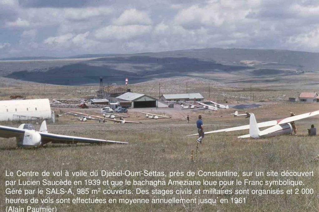 Le Centre de vol à voile du Djebel-Oum-Settas, près de Constantine, sur un site découvert par Lucien Saucède en 1939 et que le bachagha Ameziane loue pour le Franc symbolique. Géré par le SALS-A, 985 m2 couverts. Des stages civils et militaires sont organisés et 2 000 heures de vols sont effectuées en moyenne annuellement jusqu’en 1961 (Alain Paumier)