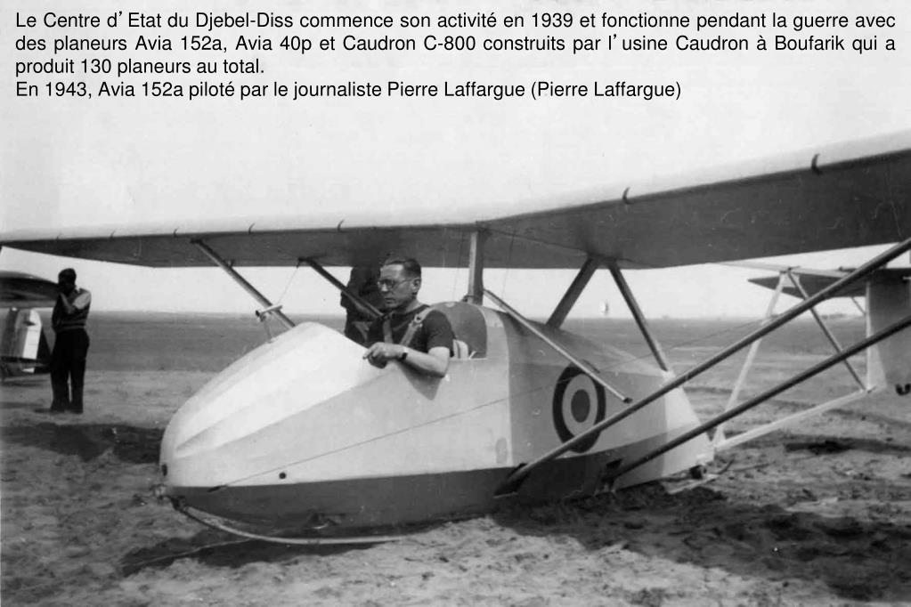 Le Centre d’Etat du Djebel-Diss commence son activité en 1939 et fonctionne pendant la guerre avec des planeurs Avia 152a, Avia 40p et Caudron C-800 construits par l’usine Caudron à Boufarik qui a produit 130 planeurs au total. En 1943, Avia 152a piloté par le journaliste Pierre Laffargue (Pierre Laffargue)