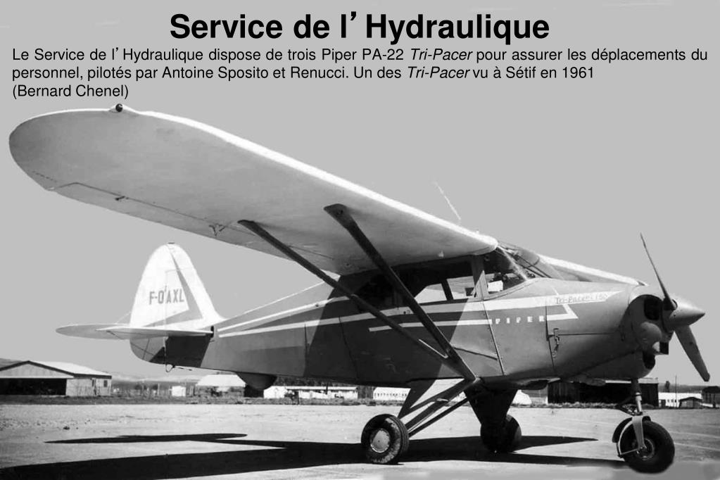 Service de l’Hydraulique Le Service de l’Hydraulique dispose de trois Piper PA-22 Tri-Pacer pour assurer les déplacements du personnel, pilotés par Antoine Sposito et Renucci. Un des Tri-Pacer vu à Sétif en 1961 (Bernard Chenel)
