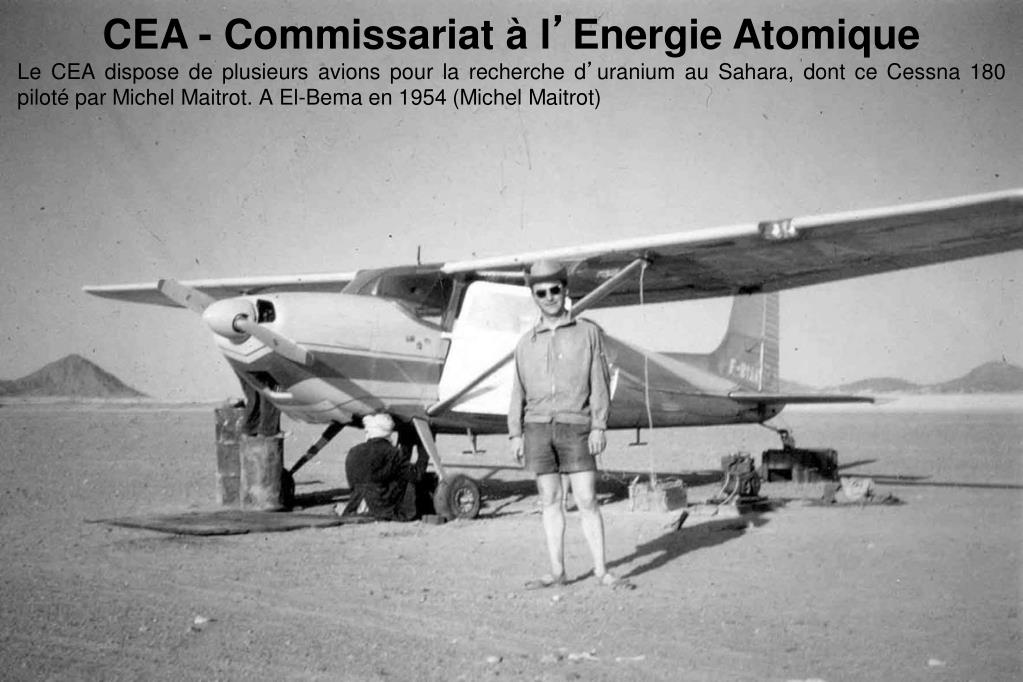 CEA - Commissariat à l’Energie Atomique Le CEA dispose de plusieurs avions pour la recherche d’uranium au Sahara, dont ce Cessna 180 piloté par Michel Maitrot. A El-Bema en 1954 (Michel Maitrot)