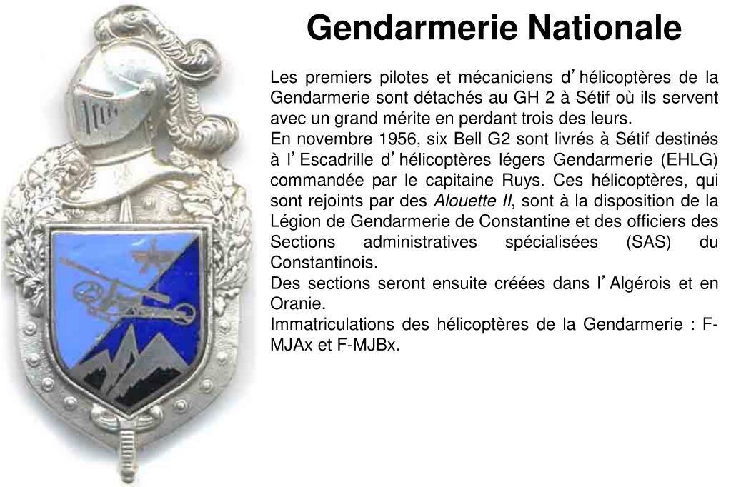 Gendarmerie Nationale Les premiers pilotes et mécaniciens d’hélicoptères de la Gendarmerie sont détachés au GH 2 à Sétif où ils servent avec un grand mérite en perdant trois des leurs. En novembre 1956, six Bell G2 sont livrés à Sétif destinés à l’Escadrille d’hélicoptères légers Gendarmerie (EHLG) commandée par le capitaine Ruys. Ces hélicoptères, qui sont rejoints par des Alouette II, sont à la disposition de la Légion de Gendarmerie de Constantine et des officiers des Sections administratives spécialisées (SAS) du Constantinois. Des sections seront ensuite créées dans l’Algérois et en Oranie. Immatriculations des hélicoptères de la Gendarmerie : F-MJAx et F-MJBx.