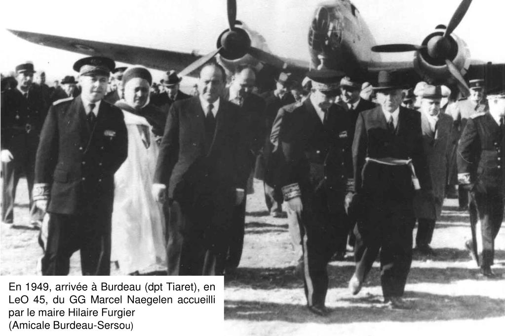 En 1949, arrivée à Burdeau (dpt Tiaret), en LeO 45, du GG Marcel Naegelen accueilli par le maire Hilaire Furgier (Amicale Burdeau-Sersou)