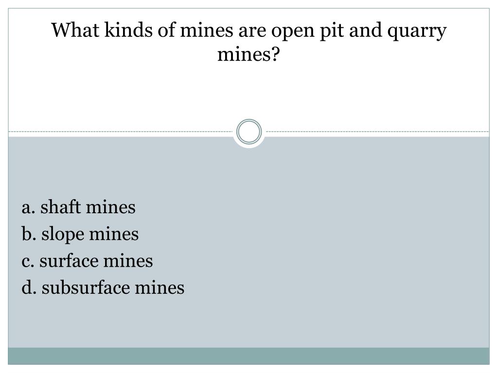 What kinds of mines are open pit and quarry mines? a. shaft mines b. slope mines c. surface mines d. subsurface mines