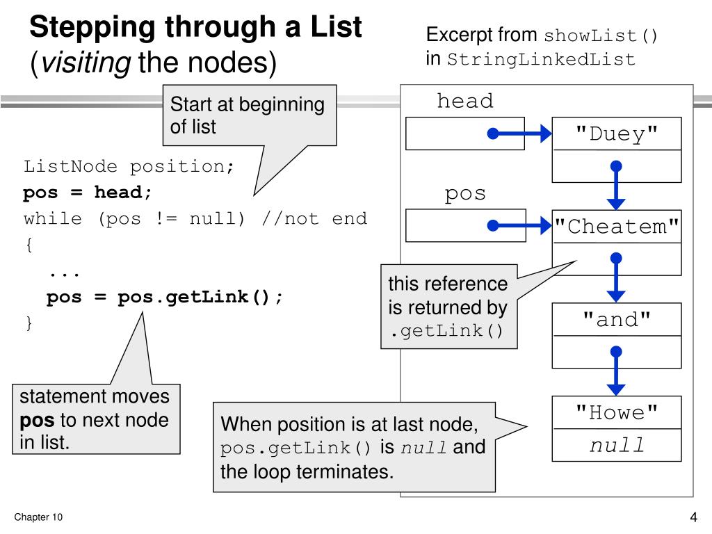 head pos "and" Stepping through a List(visiting the nodes) Excerpt from showList() in StringLinkedList Start at beginning of list ListNode position; pos = head; while (pos != null) //not end { ... pos = pos.getLink(); } "Duey" "Cheatem" this reference is returned by .getLink() statement moves pos to next node in list. "Howe" When position is at last node, pos.getLink() is null and the loop terminates. null