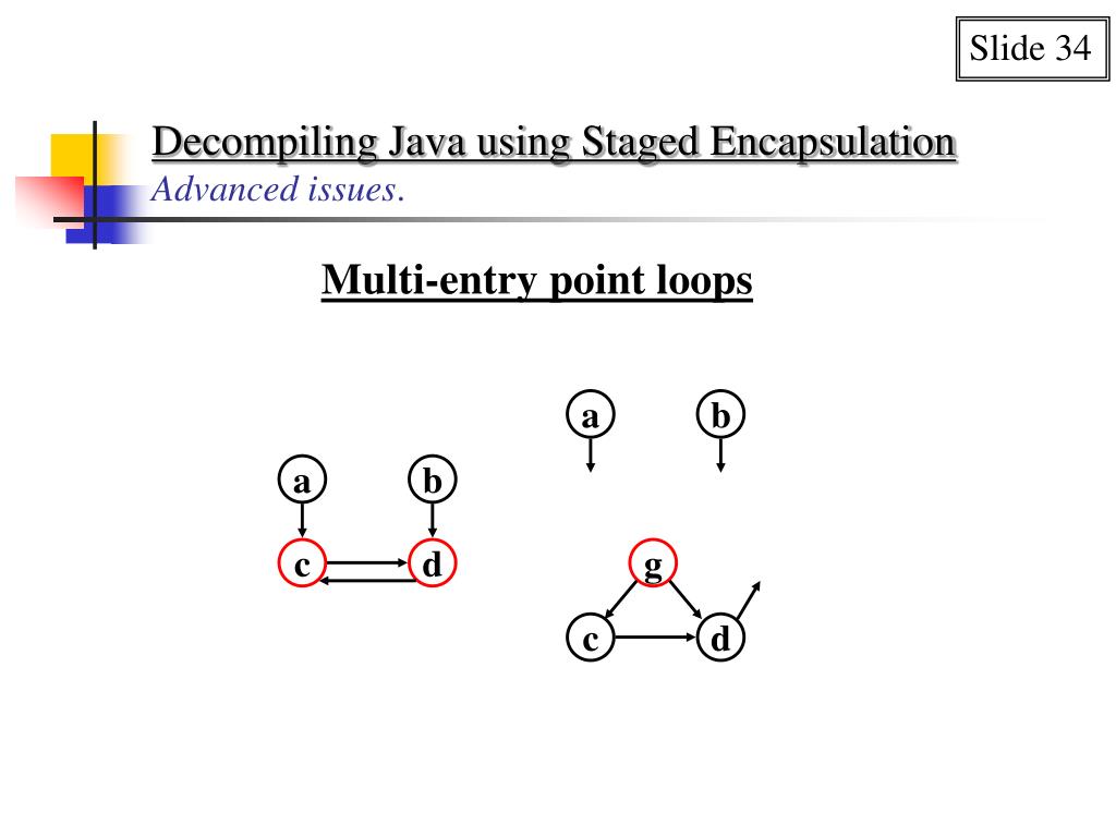 a b c d Slide 33 Decompiling Java using Staged EncapsulationAdvanced issues. Multi-entry point loops a b c d