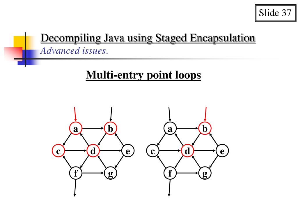 Slide 36 Decompiling Java using Staged EncapsulationAdvanced issues. Multi-entry point loops a b c d e f g