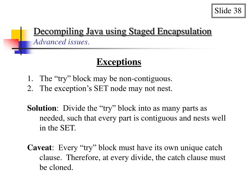 Slide 38 Decompiling Java using Staged EncapsulationAdvanced issues. Exceptions • The “try” block may be non-contiguous. • The exception’s SET node may not nest. • Solution: Divide the “try” block into as many parts as needed, such that every part is contiguous and nests well in the SET. • Caveat: Every “try” block must have its own unique catch clause. Therefore, at every divide, the catch clause must be cloned.