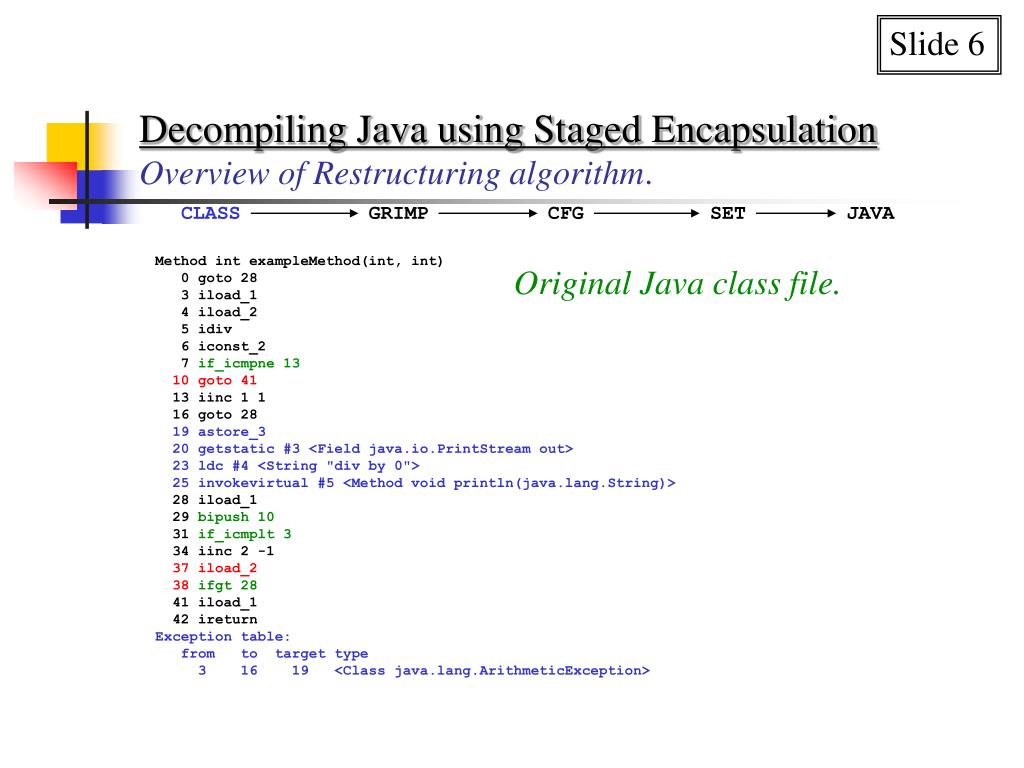 label_0: while (a()) { while (b()) { if (c()) break label_0; } d(); // missed by break } label_0: { while (b()) { if (c()) break label_0; } d(); // missed again } Slide 5 Decompiling Java using Staged EncapsulationWhy restructuring to Java is interesting. • Java’s interesting properties: • No gotos, so there’s no easy fall-back solution. • Exceptions. • Multi-level breaks and continues. • Labeled control flow statements, and labeled blocks