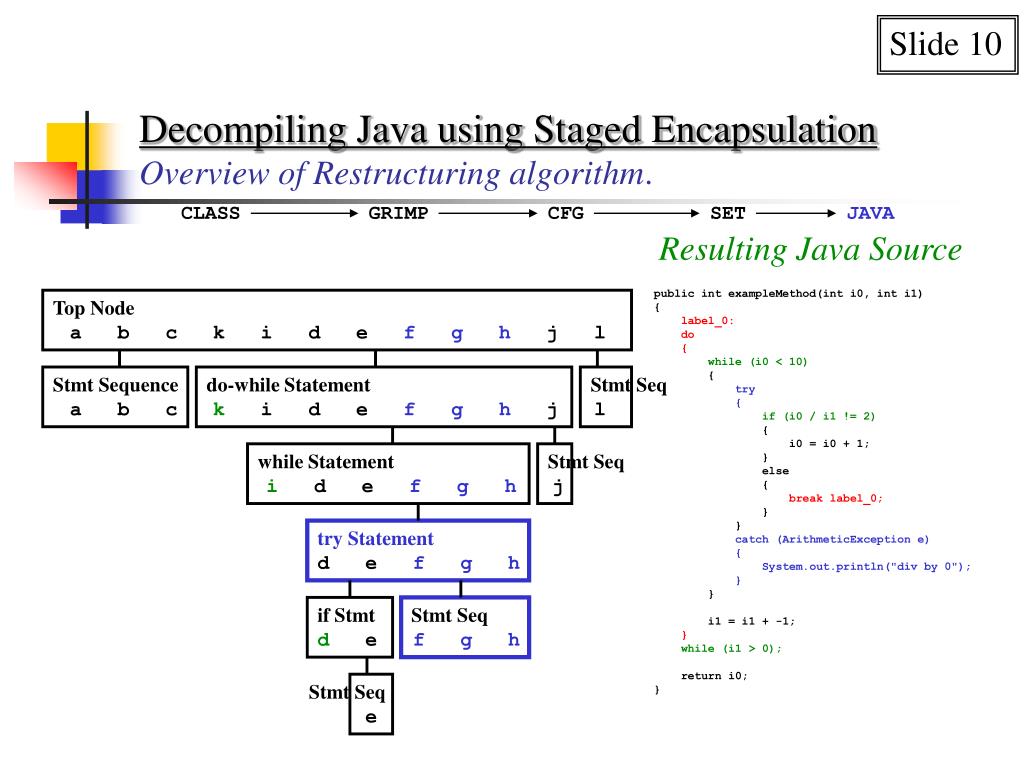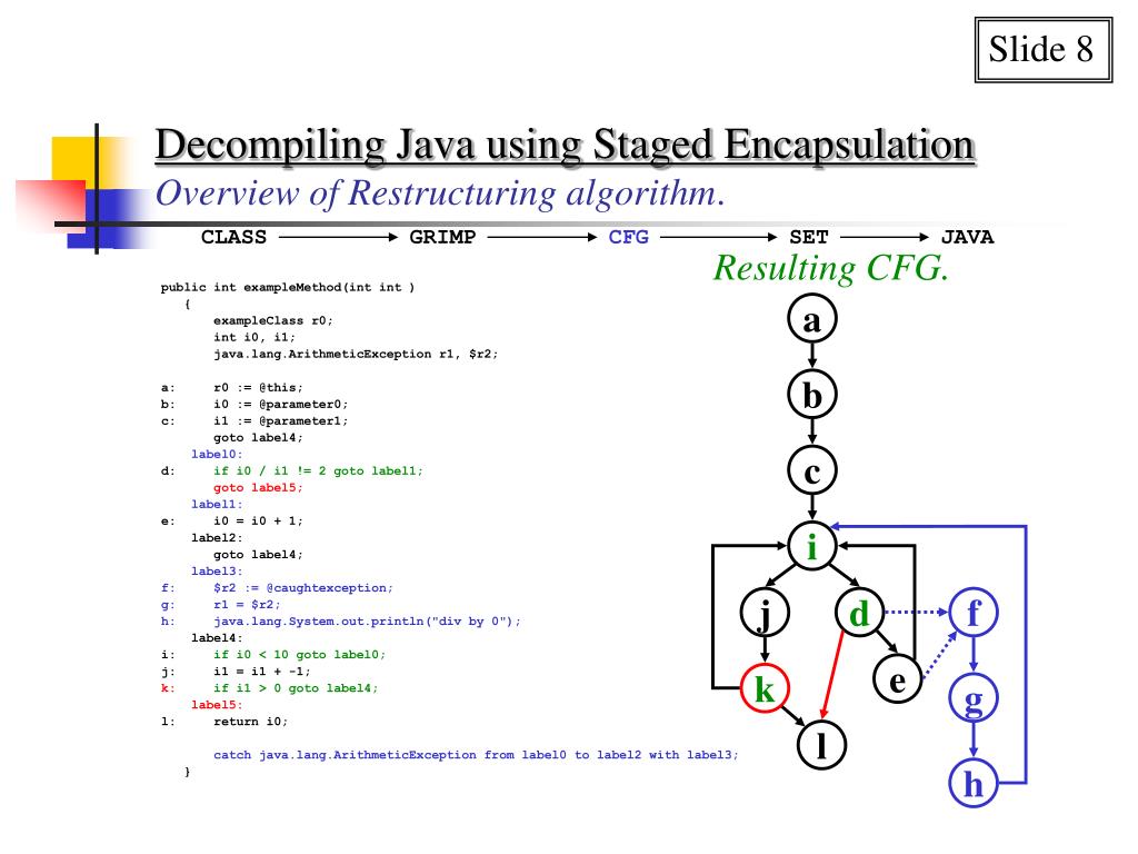 CLASS GRIMP CFG SET JAVA Slide 7 Decompiling Java using Staged EncapsulationOverview of Restructuring algorithm. public int exampleMethod(int int ) { exampleClass r0; int i0, i1; java.lang.ArithmeticException r1, $r2; r0 := @this; i0 := @parameter0; i1 := @parameter1; goto label4; label0: if i0 / i1 != 2 goto label1; goto label5; label1: i0 = i0 + 1; label2: goto label4; label3: $r2 := @caughtexception; r1 = $r2; java.lang.System.out.println("div by 0"); label4: if i0 < 10 goto label0; i1 = i1 + -1; if i1 > 0 goto label4; label5: return i0; catch java.lang.ArithmeticException from label0 to label2 with label3; } Resulting Grimp.