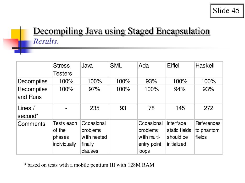 Slide 45 Decompiling Java using Staged EncapsulationResults. * based on tests with a mobile pentium III with 128M RAM