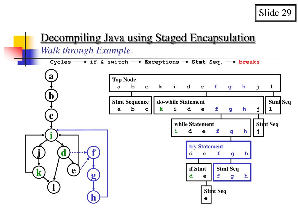 Cycles if & switch Exceptions Stmt Seq. breaks Slide 28 Decompiling Java using Staged EncapsulationWalk through Example. a Top Node a b c k i d e f g h j l b Stmt Sequence do-while Statement Stmt Seq a b c k i d e f g h j l c while Statement Stmt Seq i d e f g h j i try Statement j d f d e f g h e if Stmt Stmt Seq k g d e f g h l Stmt Seq h e