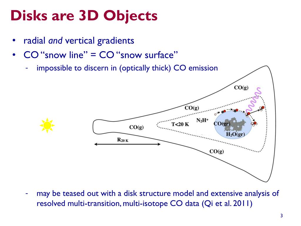 radial and vertical gradients CO “snow line” = CO “snow surface” impossible to discern in (optically thick) CO emission may be teased out with a disk structure model and extensive analysis of resolved multi-transition, multi-isotope CO data (Qi et al. 2011) Disks are 3D Objects
