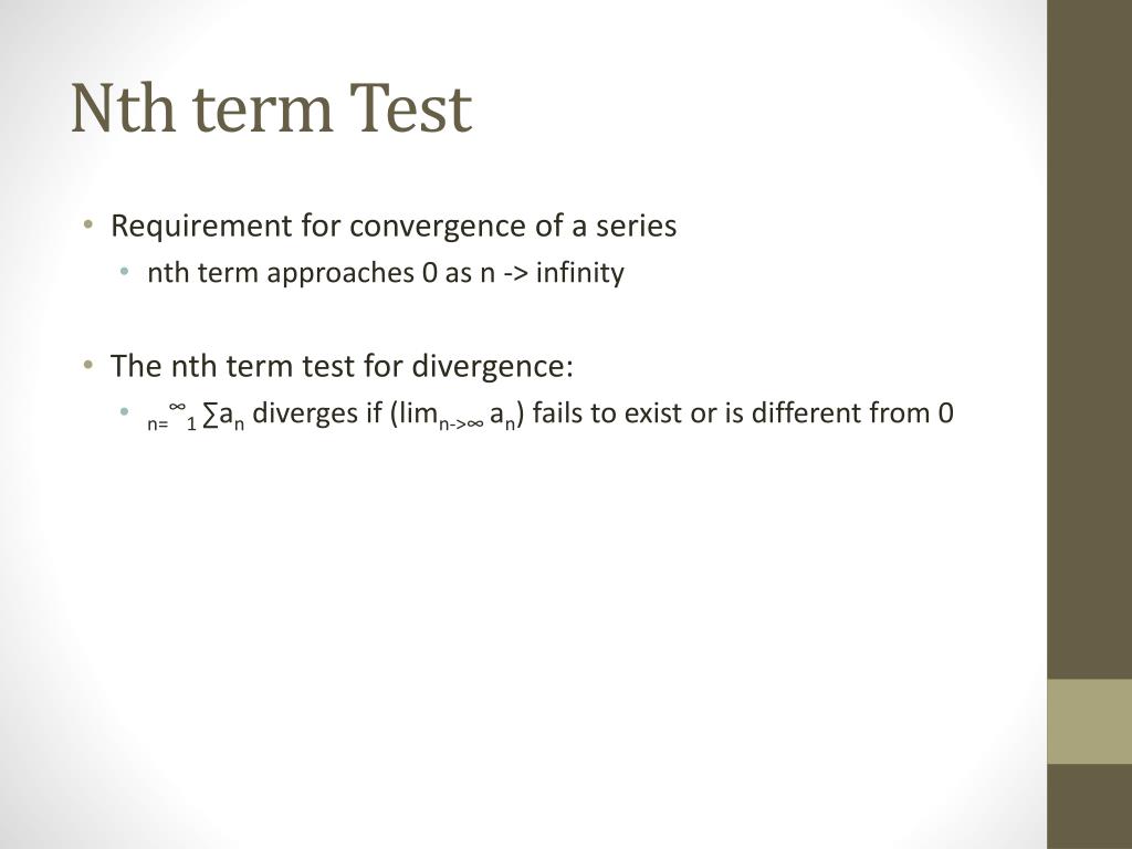 Nth term Test • Requirement for convergence of a series • nth term approaches 0 as n -> infinity • The nth term test for divergence: • n=∞1∑an diverges if (limn->∞ an) fails to exist or is different from 0