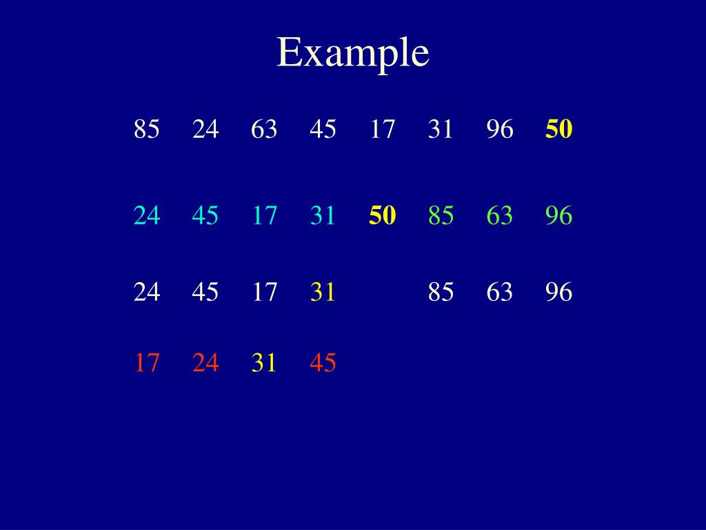 Some Observations Multibase case (0 and 1) Any element can be used as the pivot The pivot divides the array elements into two groups elements smaller than the pivot elements larger than the pivot Some choice of pivots are better than others The best choice of pivots equally divides the array Elements equal to the pivot can go in either group
