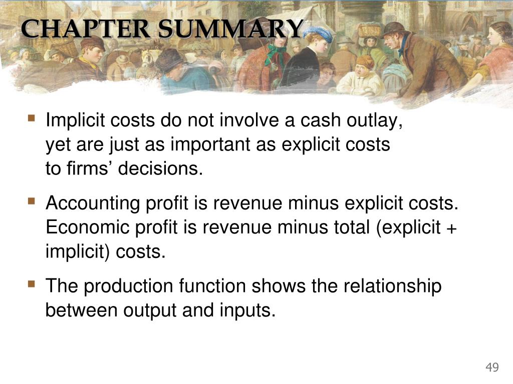 CHAPTER SUMMARY • Implicit costs do not involve a cash outlay, yet are just as important as explicit costs to firms’ decisions. • Accounting profit is revenue minus explicit costs. Economic profit is revenue minus total (explicit + implicit) costs. • The production function shows the relationship between output and inputs. 49