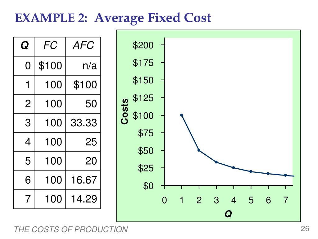 EXAMPLE 2: Average Fixed Cost n/a $100 50 33.33 25 20 16.67 14.29 0 Average fixed cost (AFC)is fixed cost divided by the quantity of output: AFC = FC/Q Q FC AFC 0 $100 1 100 2 100 3 100 Notice that AFC falls as Q rises: The firm is spreading its fixed costs over a larger and larger number of units. 4 100 5 100 6 100 7 100 THE COSTS OF PRODUCTION