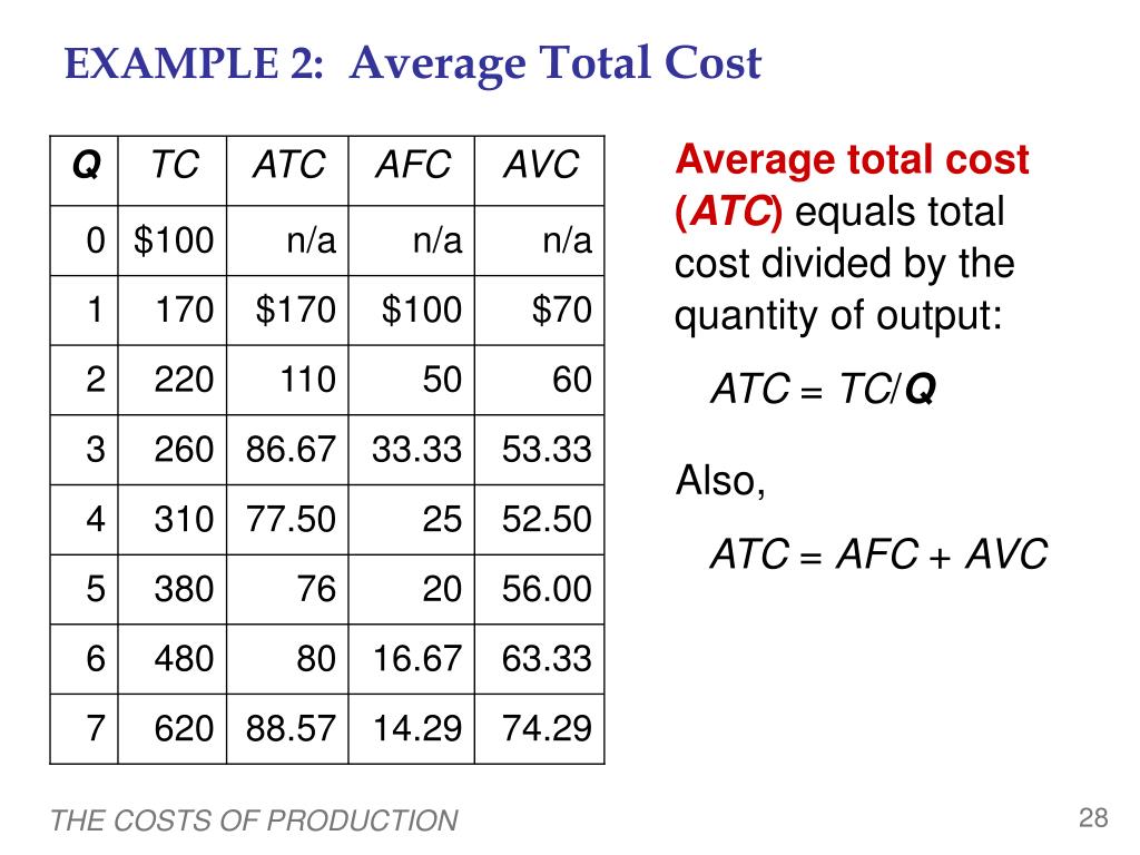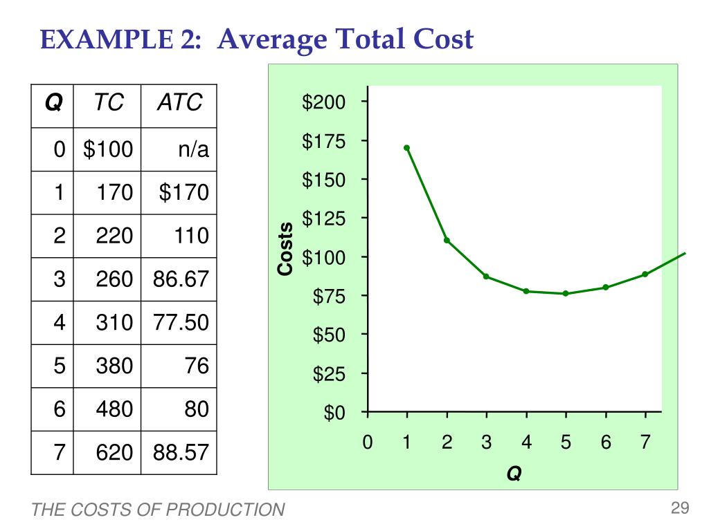 EXAMPLE 2: Average Total Cost AFC AVC n/a n/a n/a $170 $100 $70 110 50 60 86.67 33.33 53.33 77.50 25 52.50 76 20 56.00 80 16.67 63.33 88.57 14.29 74.29 0 Average total cost (ATC) equals total cost divided by the quantity of output: ATC = TC/Q Q TC ATC 0 $100 1 170 2 220 3 260 Also, ATC = AFC + AVC 4 310 5 380 6 480 7 620 THE COSTS OF PRODUCTION