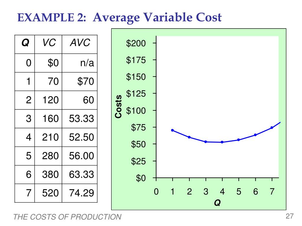 EXAMPLE 2: Average Variable Cost n/a $70 60 53.33 52.50 56.00 63.33 74.29 0 Average variable cost (AVC)is variable cost divided by the quantity of output: AVC = VC/Q Q VC AVC 0 $0 1 70 2 120 3 160 As Q rises, AVC may fall initially. In most cases, AVC will eventually rise as output rises. 4 210 5 280 6 380 7 520 THE COSTS OF PRODUCTION