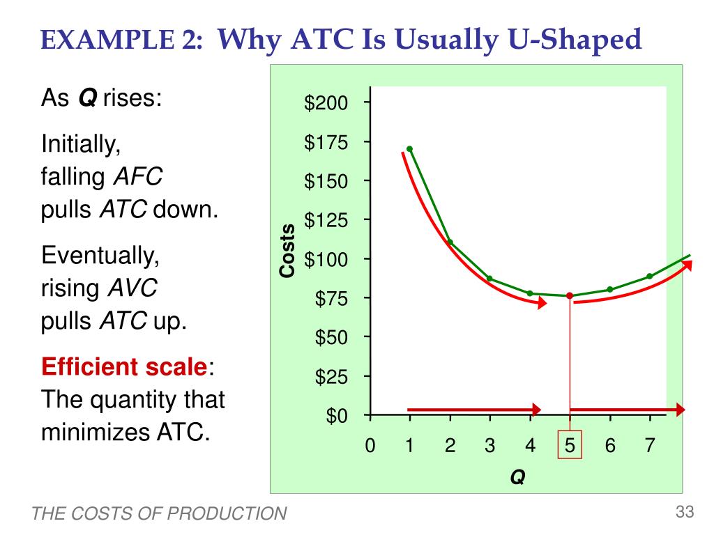 EXAMPLE 2: Why ATC Is Usually U-Shaped $200 $175 $150 $125 Costs $100 $75 $50 $25 $0 0 1 2 3 4 5 6 7 Q 0 As Q rises: Initially, falling AFCpulls ATC down. Eventually, rising AVCpulls ATC up. Efficient scale:The quantity that minimizes ATC. THE COSTS OF PRODUCTION