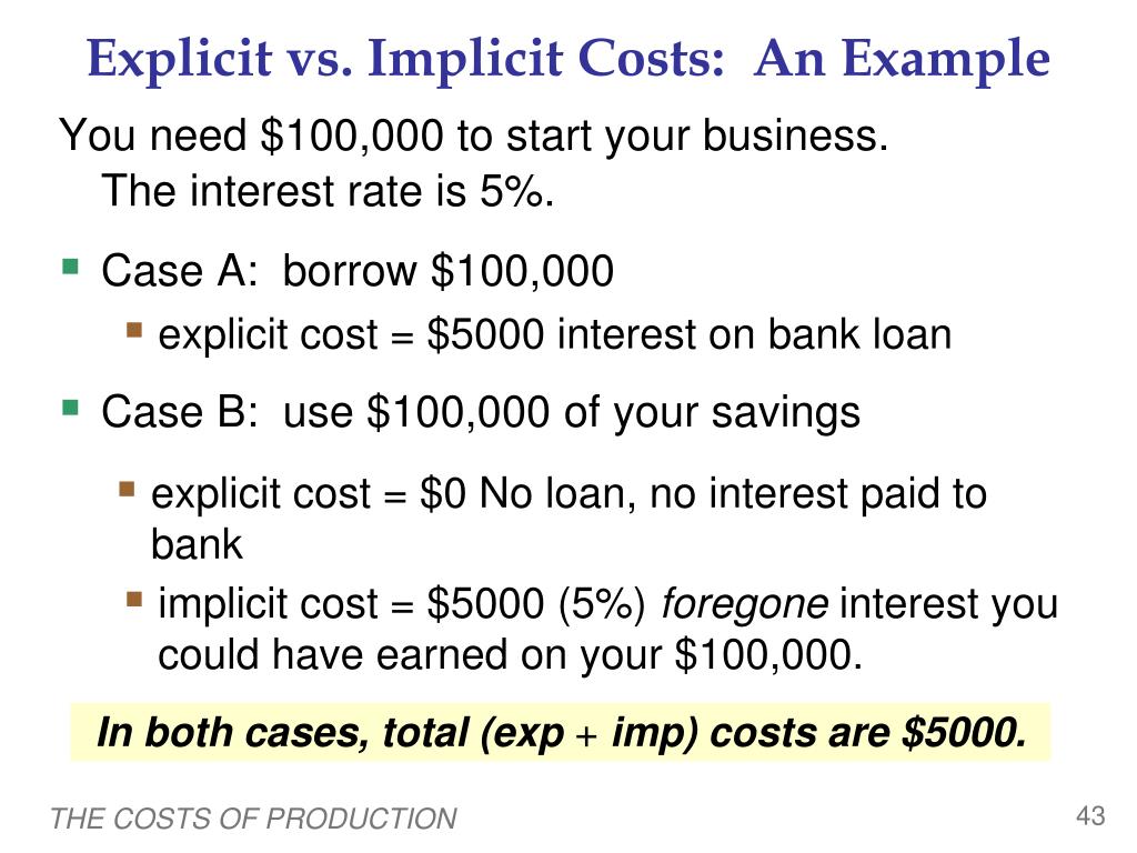 Explicit vs. Implicit Costs: An Example You need $100,000 to start your business. The interest rate is 5%. Case A: borrow $100,000 explicit cost = $5000 interest on bank loan Case B: use $100,000 of your savings explicit cost = $0 No loan, no interest paid to bank implicit cost = $5000 (5%) foregone interest you could have earned on your $100,000. 0 In both cases, total (exp+ imp) costs are $5000. THE COSTS OF PRODUCTION