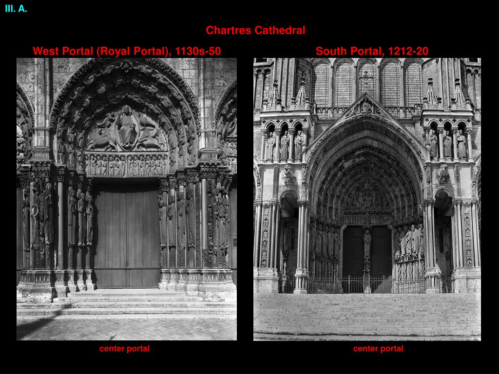 III. A. Chartres Cathedral West Portal (Royal Portal), 1130s-50 South Portal, 1212-20 center portal center portal