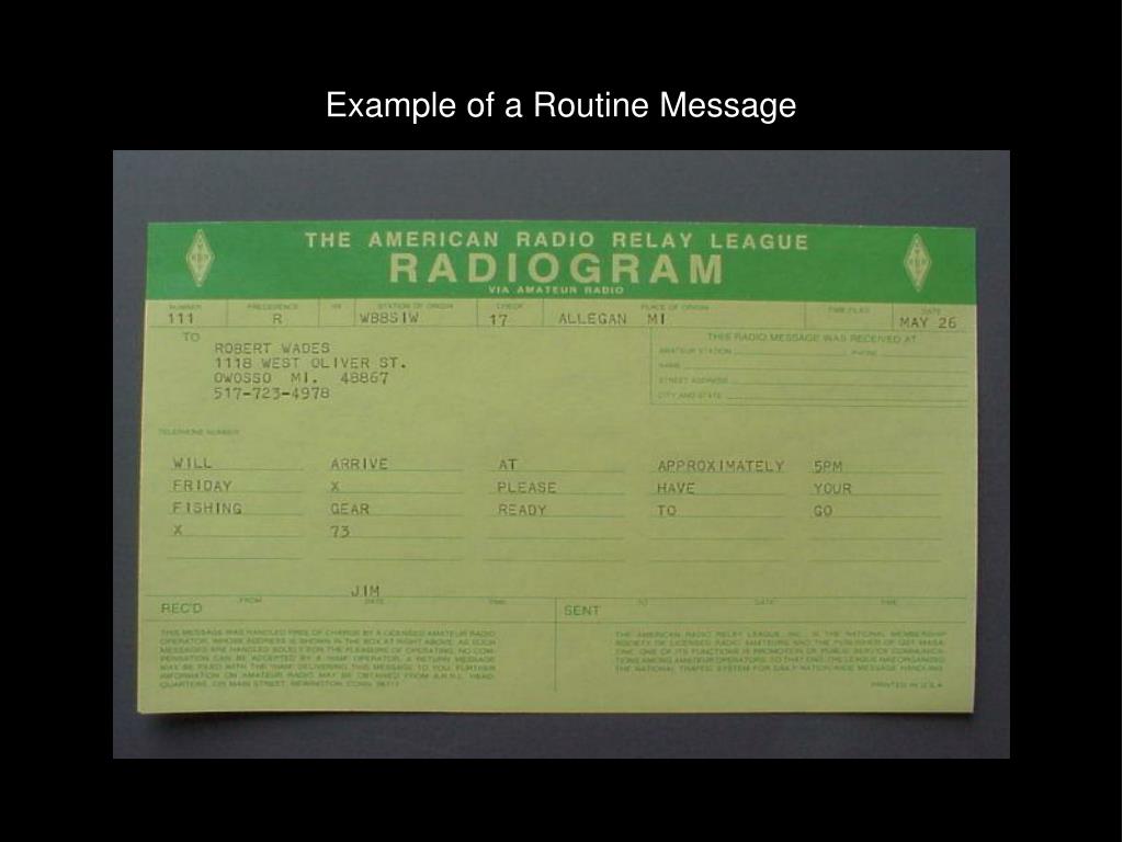 Precedence (cont'd) Four Categories Emergency: Life or Death – always spelled out! Priority: Time sensitive – abbreviated “P” Welfare: Information pertaining to the well being of an individual in a disaster area – abbreviated “W” Routine: Casual greeting or routine public service message – abbreviated “R”