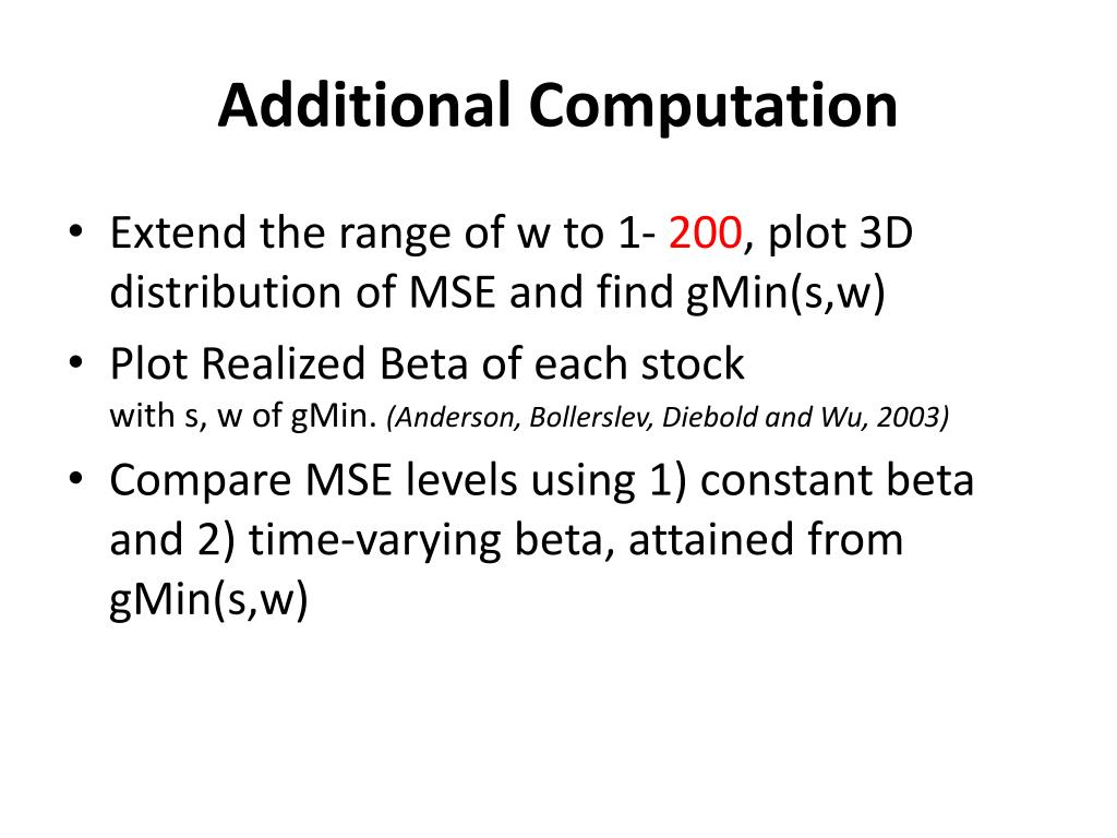 Additional Computation • Extend the range of w to 1- 200, plot 3D distribution of MSE and find gMin(s,w) • Plot Realized Beta of each stock with s, w of gMin. (Anderson, Bollerslev, Diebold and Wu, 2003) • Compare MSE levels using 1) constant beta and 2) time-varying beta, attained from gMin(s,w)