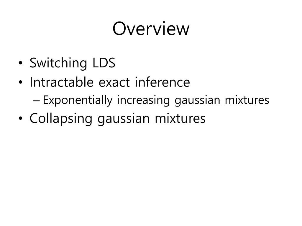 Overview • Switching LDS • Intractable exact inference • Exponentially increasing gaussian mixtures • Collapsing gaussian mixtures