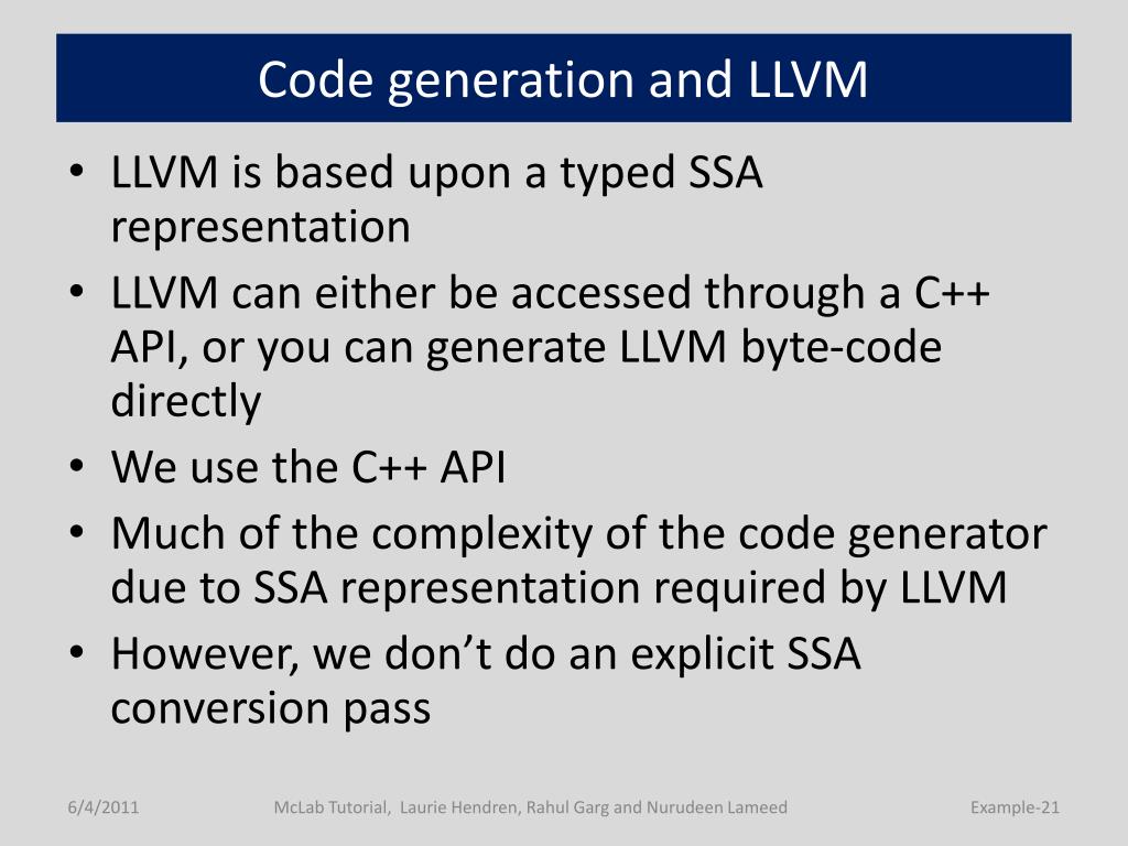 Code generation and LLVM • LLVM is based upon a typed SSA representation • LLVM can either be accessed through a C++ API, or you can generate LLVM byte-code directly • We use the C++ API • Much of the complexity of the code generator due to SSA representation required by LLVM • However, we don’t do an explicit SSA conversion pass McLab Tutorial, Laurie Hendren, Rahul Garg and Nurudeen Lameed