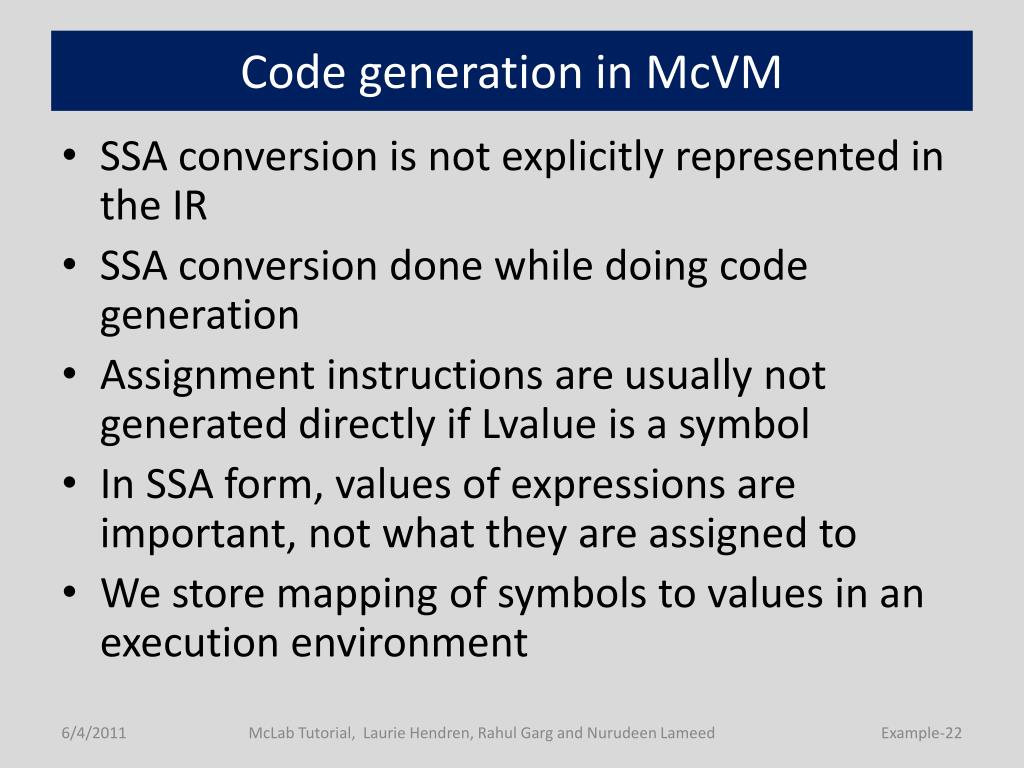 Code generation in McVM • SSA conversion is not explicitly represented in the IR • SSA conversion done while doing code generation • Assignment instructions are usually not generated directly if Lvalue is a symbol • In SSA form, values of expressions are important, not what they are assigned to • We store mapping of symbols to values in an execution environment McLab Tutorial, Laurie Hendren, Rahul Garg and Nurudeen Lameed