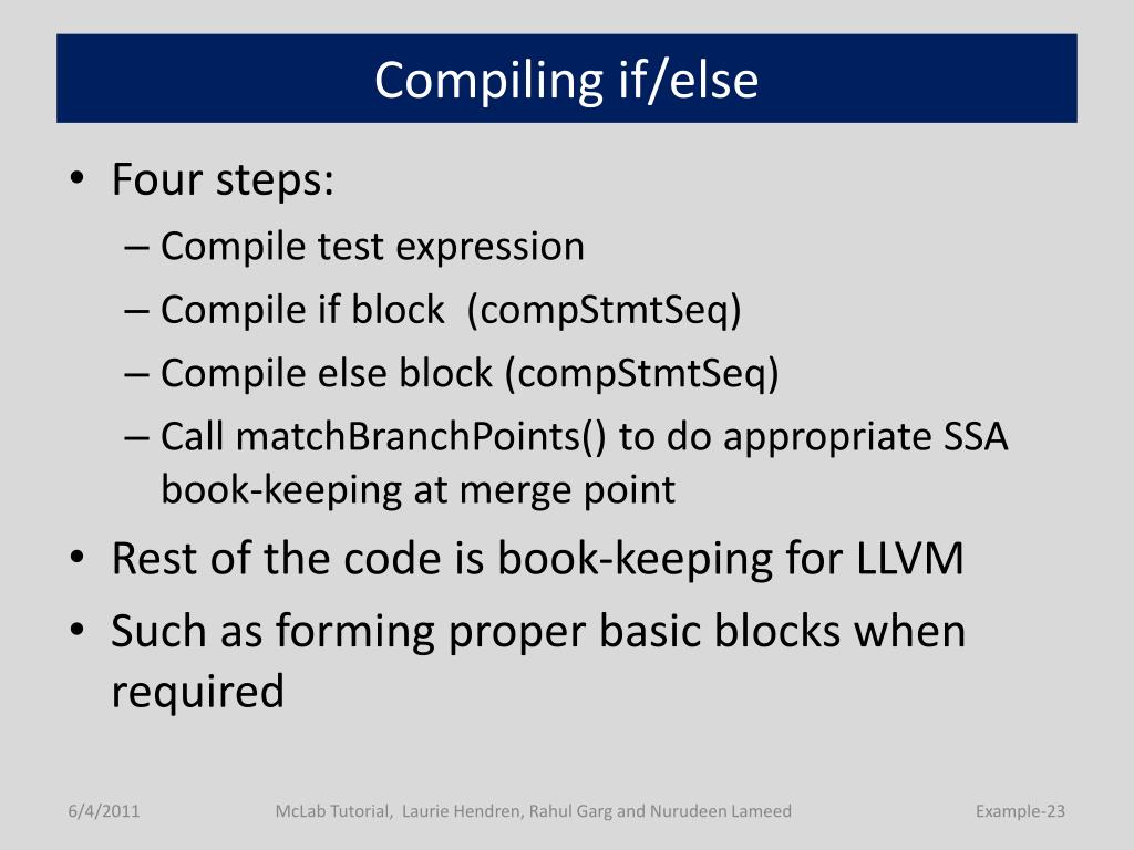 Compiling if/else • Four steps: • Compile test expression • Compile if block (compStmtSeq) • Compile else block (compStmtSeq) • Call matchBranchPoints() to do appropriate SSA book-keeping at merge point • Rest of the code is book-keeping for LLVM • Such as forming proper basic blocks when required McLab Tutorial, Laurie Hendren, Rahul Garg and Nurudeen Lameed