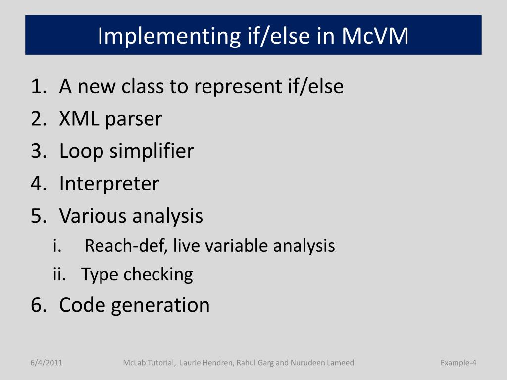 McLab Tutorialwww.sable.mcgill.ca/mclab Part 7 – McVM implementation example: if/else construct Implementation in interpreter Implementation in JIT compiler McLab Tutorial, Laurie Hendren, RahulGarg and NurudeenLameed TexPoint fonts used in EMF. Read the TexPoint manual before you delete this box.: AAAAAAAAAAA