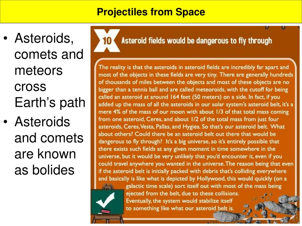 Projectiles from Space Asteroids, comets and meteors cross Earth’s path Asteroids and comets are known as bolides