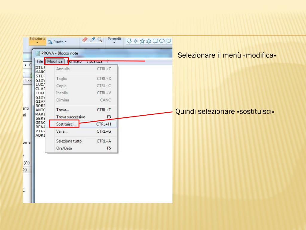 Selezionare il menù «modifica» Quindi selezionare «sostituisci»