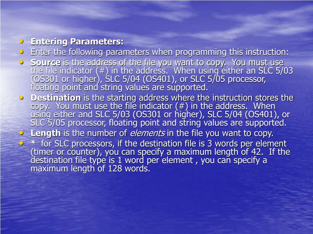 Entering Parameters: • Enter the following parameters when programming this instruction: • Source is the address of the file you want to copy. You must use the file indicator (#) in the address. When using either an SLC 5/03 (OS301 or higher), SLC 5/04 (OS401), or SLC 5/05 processor, floating point and string values are supported. • Destination is the starting address where the instruction stores the copy. You must use the file indicator (#) in the address. When using either and SLC 5/03 (OS301 or higher), SLC 5/04 (OS401), or SLC 5/05 processor, floating point and string values are supported. • Length is the number of elements in the file you want to copy. • * for SLC processors, if the destination file is 3 words per element (timer or counter), you can specify a maximum length of 42. If the destination file type is 1 word per element , you can specify a maximum length of 128 words.