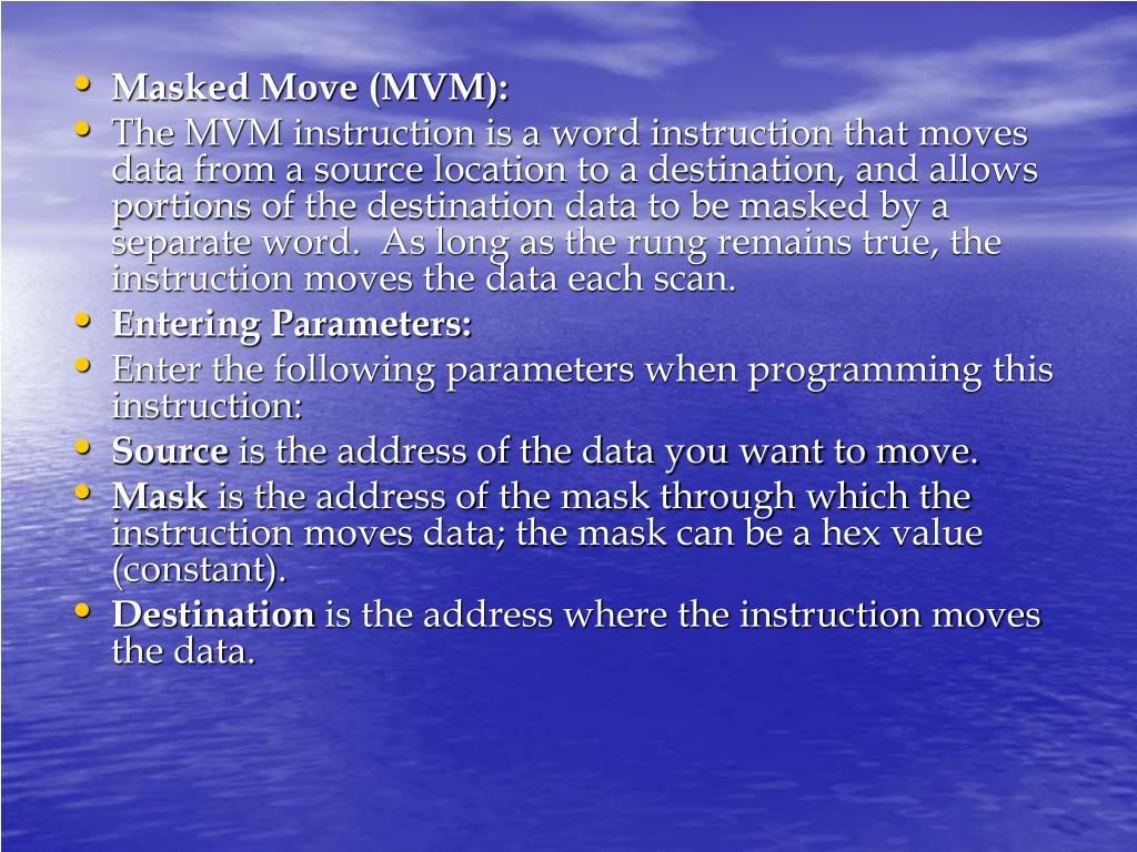 Masked Move (MVM): • The MVM instruction is a word instruction that moves data from a source location to a destination, and allows portions of the destination data to be masked by a separate word. As long as the rung remains true, the instruction moves the data each scan. • Entering Parameters: • Enter the following parameters when programming this instruction: • Source is the address of the data you want to move. • Mask is the address of the mask through which the instruction moves data; the mask can be a hex value (constant). • Destination is the address where the instruction moves the data.