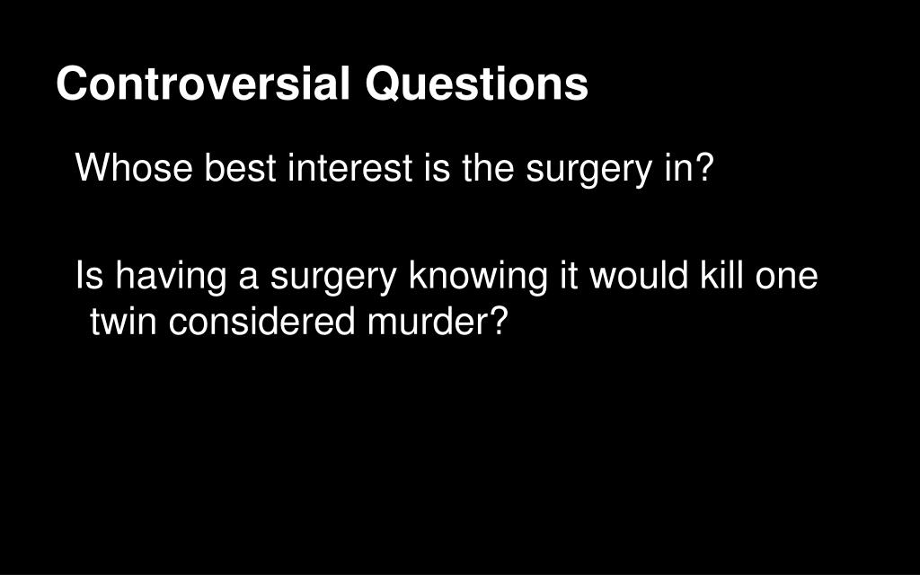 Controversial Questions Whose best interest is the surgery in? Is having a surgery knowing it would kill one twin considered murder?