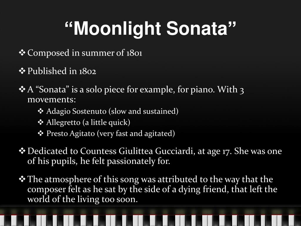 “Moonlight Sonata” • Composed in summer of 1801 • Published in 1802 • A “Sonata” is a solo piece for example, for piano. With 3 movements: • Adagio Sostenuto (slow and sustained) • Allegretto (a little quick) • Presto Agitato (very fast and agitated) • Dedicated to Countess GiulitteaGucciardi, at age 17. She was one of his pupils, he felt passionately for. • The atmosphere of this song was attributed to the way that the composer felt as he sat by the side of a dying friend, that left the world of the living too soon.