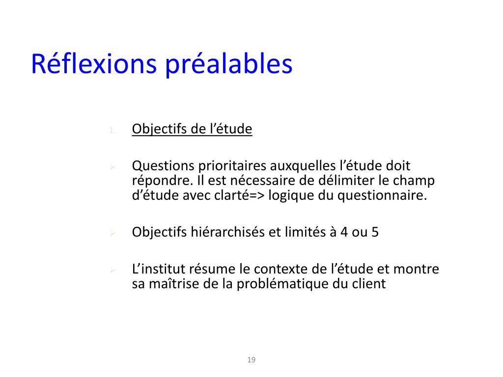 Réflexions préalables • Objectifs de l’étude • Questions prioritaires auxquelles l’étude doit répondre. Il est nécessaire de délimiter le champ d’étude avec clarté=> logique du questionnaire. • Objectifs hiérarchisés et limités à 4 ou 5 • L’institut résume le contexte de l’étude et montre sa maîtrise de la problématique du client