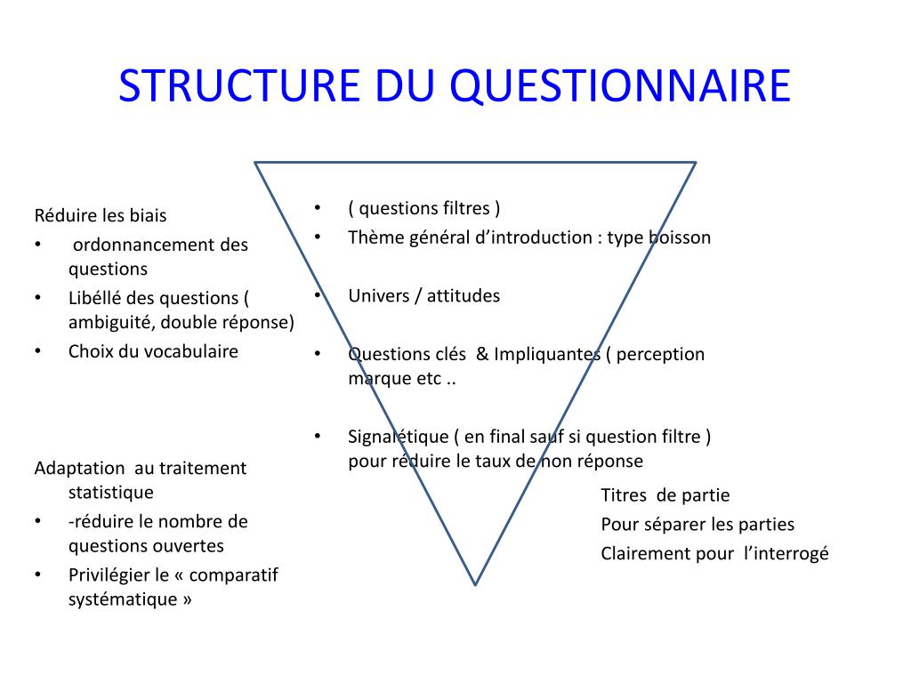 STRUCTURE DU QUESTIONNAIRE • ( questions filtres ) • Thème général d’introduction : type boisson • Univers / attitudes • Questions clés & Impliquantes ( perception marque etc .. • Signalétique ( en final sauf si question filtre ) pour réduire le taux de non réponse • Réduire les biais • ordonnancement des questions • Libéllé des questions ( ambiguité, double réponse) • Choix du vocabulaire • Adaptation au traitement statistique • -réduire le nombre de questions ouvertes • Privilégier le « comparatif systématique » • Titres de partie • Pour séparer les parties • Clairement pour l’interrogé