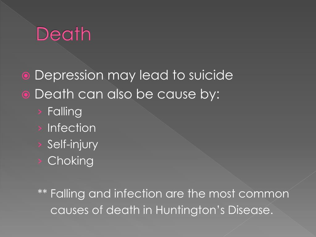 Death • Depression may lead to suicide • Death can also be cause by: • Falling • Infection • Self-injury • Choking ** Falling and infection are the most common causes of death in Huntington’s Disease.